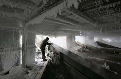 Un empleado limpia las instalaciones en una maderera de la ciudad de Lesosibirsk, en la provincia rusa de Krasnoyarsk, en Siberia, donde ese día, el 16 de febrero, la temperatura era de 20 bajo cero.Ilya Naymushin / Reuters