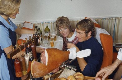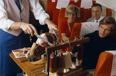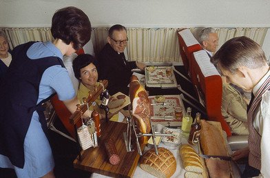 Una colección de imágenes tomadas a bordo en vuelos de Scandinavian Airlines entre las décadas de 1950 y 1980, muestra los alimentos que recibían los viajeros de primera clase. La compañía servía exquisiteces con las que los turistas modernos solo podrían soñar: entre otros productos, se les ofrecía patas enteras de jamón, exquisitos platos de caviar y bogavantes.