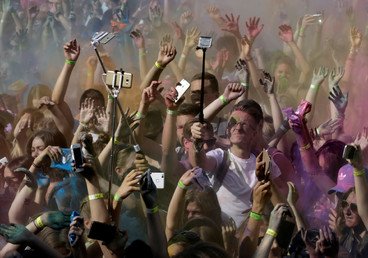 Jóvenes sacándose selfis durante el Festival de los Colores en Riga, Letonia. Ints Kalnins