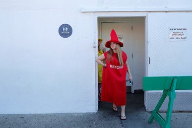 Una joven disfrazada de botella de ketchup durante la celebración del Día Internacional del 'Hot Dog' en Nueva York. Andrew Kelly