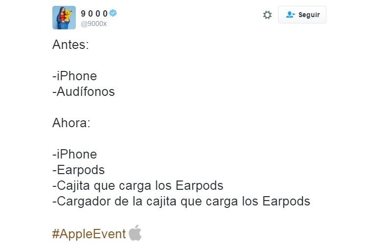 Luego de que la compañía estadounidense realizara su esperada presentación de las nuevas versiones de sus dispositivos, miles de usuarios de las redes sociales han demostrado su ingenio y humor comentando las últimas novedades tecnológicas de Apple. La atención se centró sobre todo en el último modelo del famoso iPhone y sus nuevos auriculares.