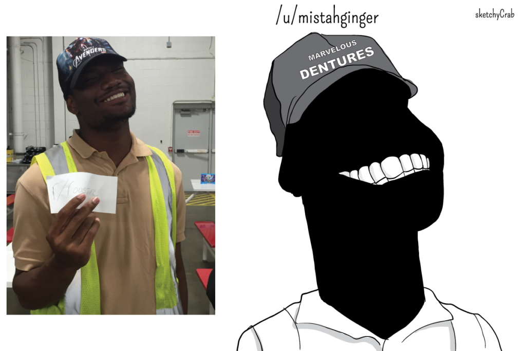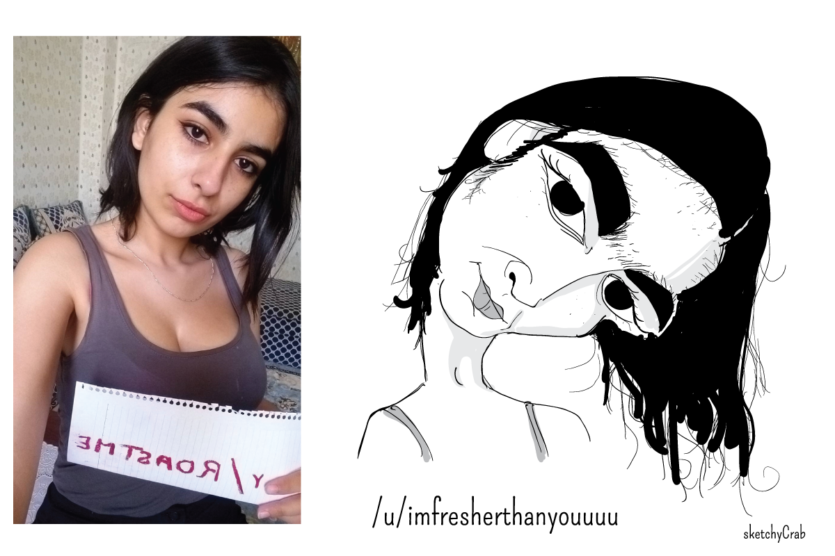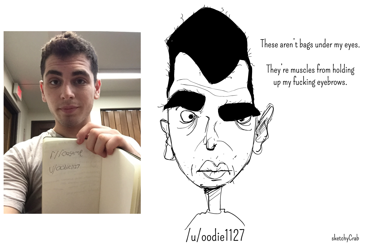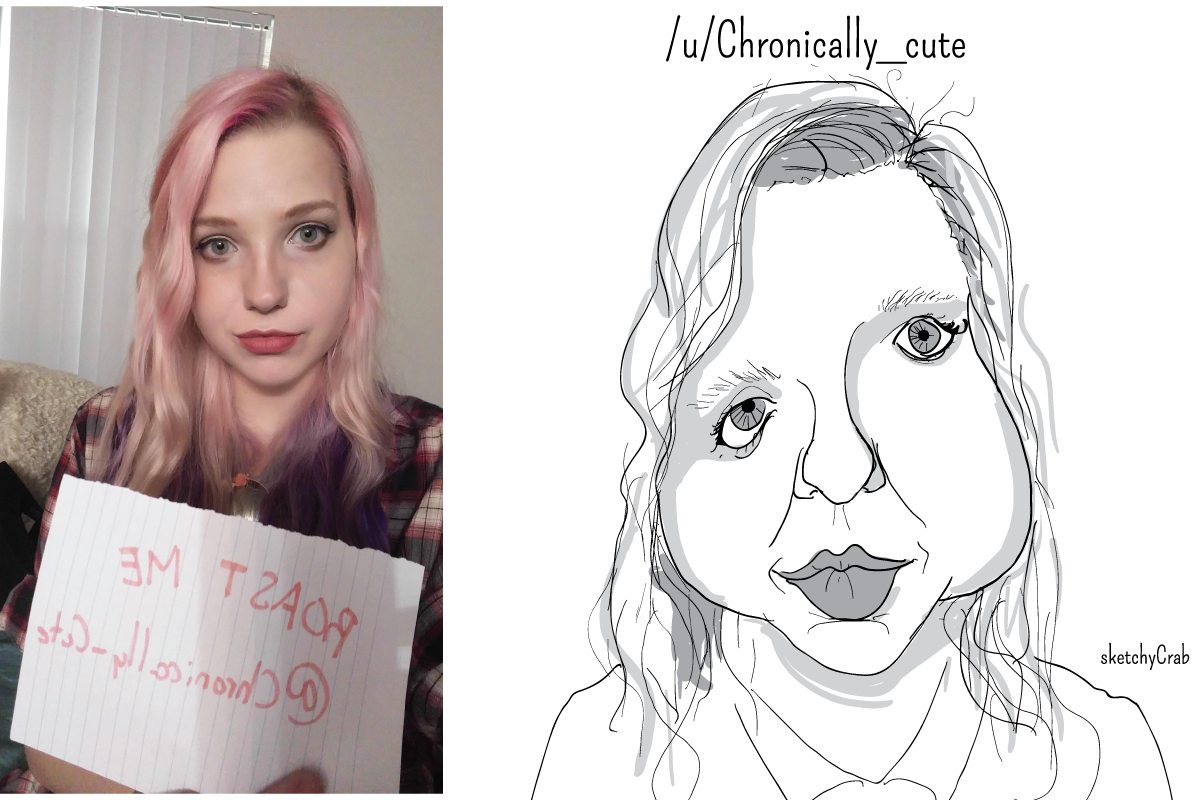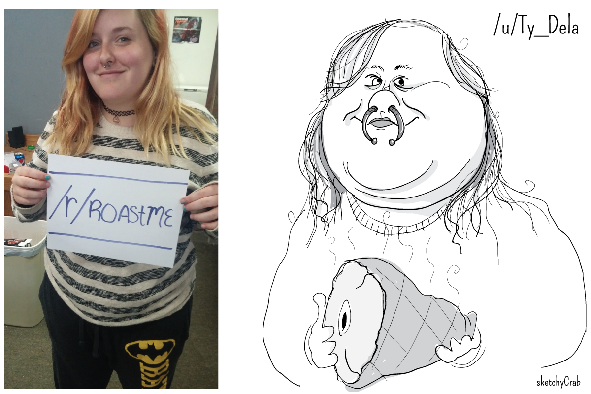 El artista SketchyCrab es conocido en las redes por hacer caricaturas explotando al máximo los defectos e imperfecciones de sus modelos. Aunque parezca mentira, muchos valientes internautas se prestan voluntarios. El caricaturista escoge una vez por semana a una 'víctima' para dibujarla como "un monstruo horrible" y enviarle a su correo electrónico una versión en alta resolución para que la imprima o coloque "en el patio delantero y espantar a los animales y niños pequeños".