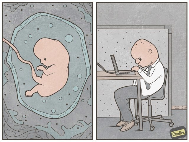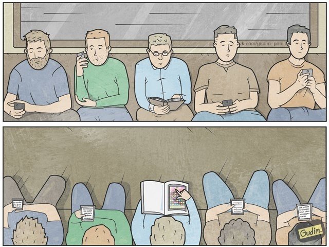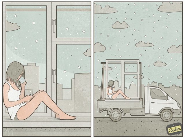 Las caricaturas del artista ruso Anton Gudim están impregnadas de una original perspectiva sobre la vida del mundo moderno. Con precisión y sarcasmo, el artista denuncia las trivialidades más universales de la sociedad actual: nuestra dependencia de las redes sociales y las nuevas tecnologías, así como la pérdida de pensamiento individual. Muchas de sus ilustraciones apelan a nuestro lado más inteligente y nos exigen mirarlas dos veces antes de poder entenderlas.