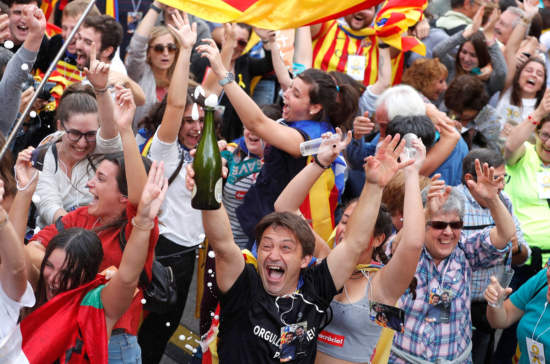 En una histórica jornada, el 'Parlament' catalán ha aprobado este viernes 27 de octubre la declaración de la "República catalana, como Estado independiente y soberano". Tras los tensos momentos vividos antes de la votación, que culminó con una victoria del 'sí', muchos habitantes de la región salieron a las calles a festejar con banderas y pancartas, donde no faltó el champán y los bailes, ni tampoco lágrimas ni abrazos.