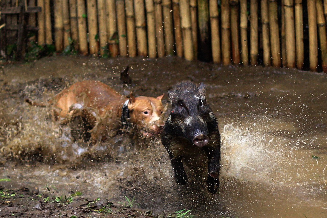 Este violento y cruel deporte, practicado en una zona remota de la isla de Java (Indonesia) y conocido como 'adu bagong', enfrenta a perros y cerdos salvajes en peleas hasta la muerte. Cientos de aldeanos llenan tribunas improvisadas para presenciar esta lucha entre canes de pelea especialmente criados para combatir y jabalíes capturados. La tradición comenzó en la década de 1960, cuando la población de jabalíes en la zona se disparó y amenazó con destruir el rendimiento de los cultivos locales.