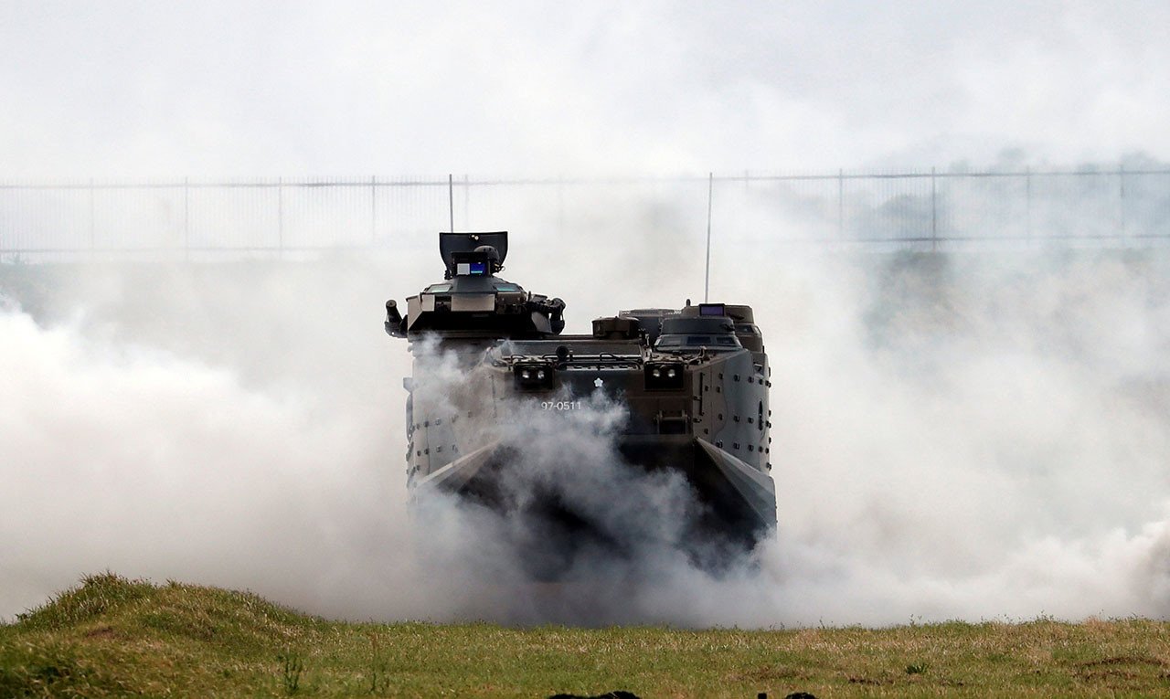 Unos 1.500 miembros de la Brigada Anfibia de Despliegue Rápido realizaron un ejercicio de demostración de 20 minutos, recuperando una isla de supuestos invasores cerca de la base militar Sasebo, al suroeste de la isla de Kyushu.