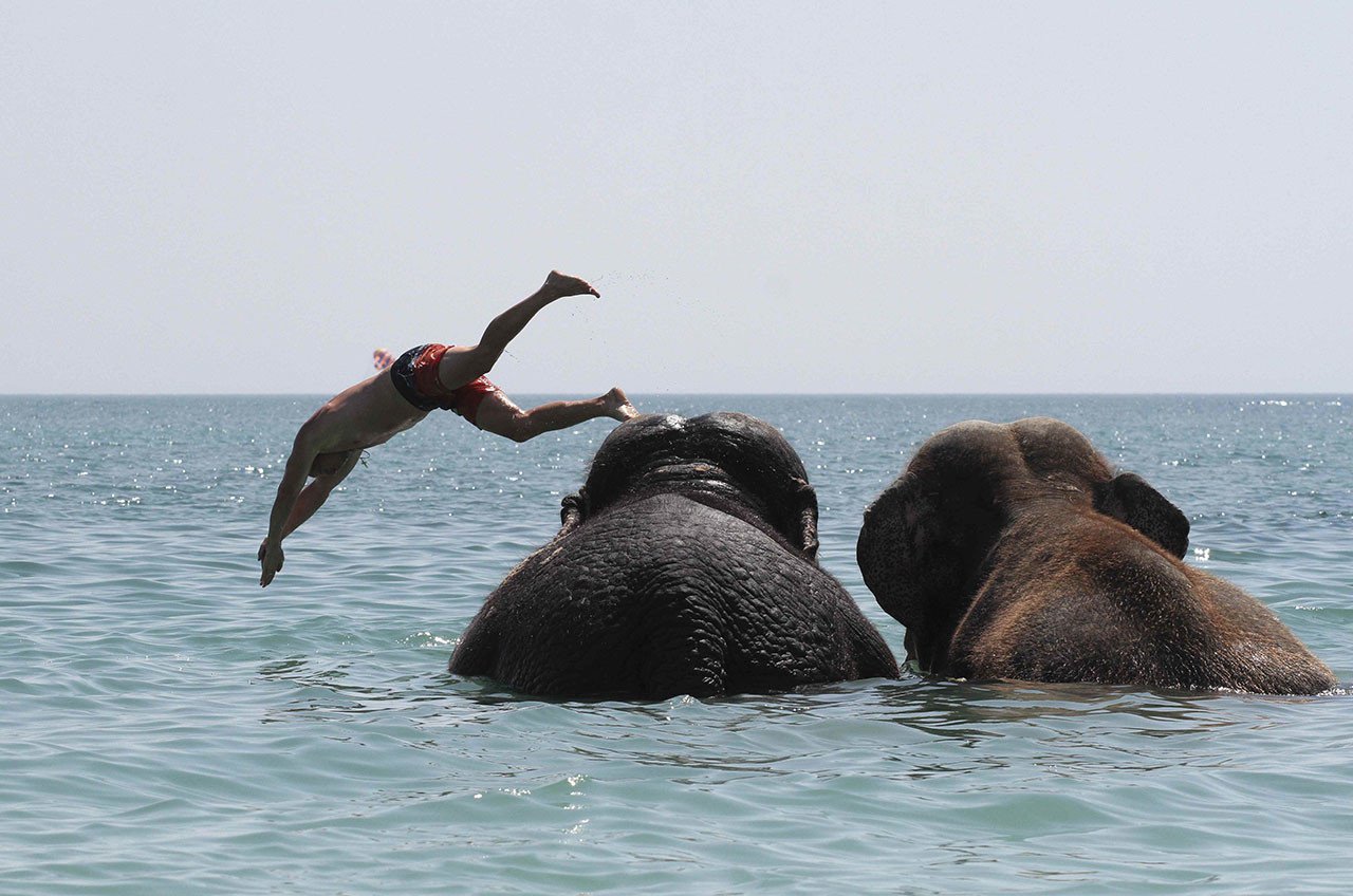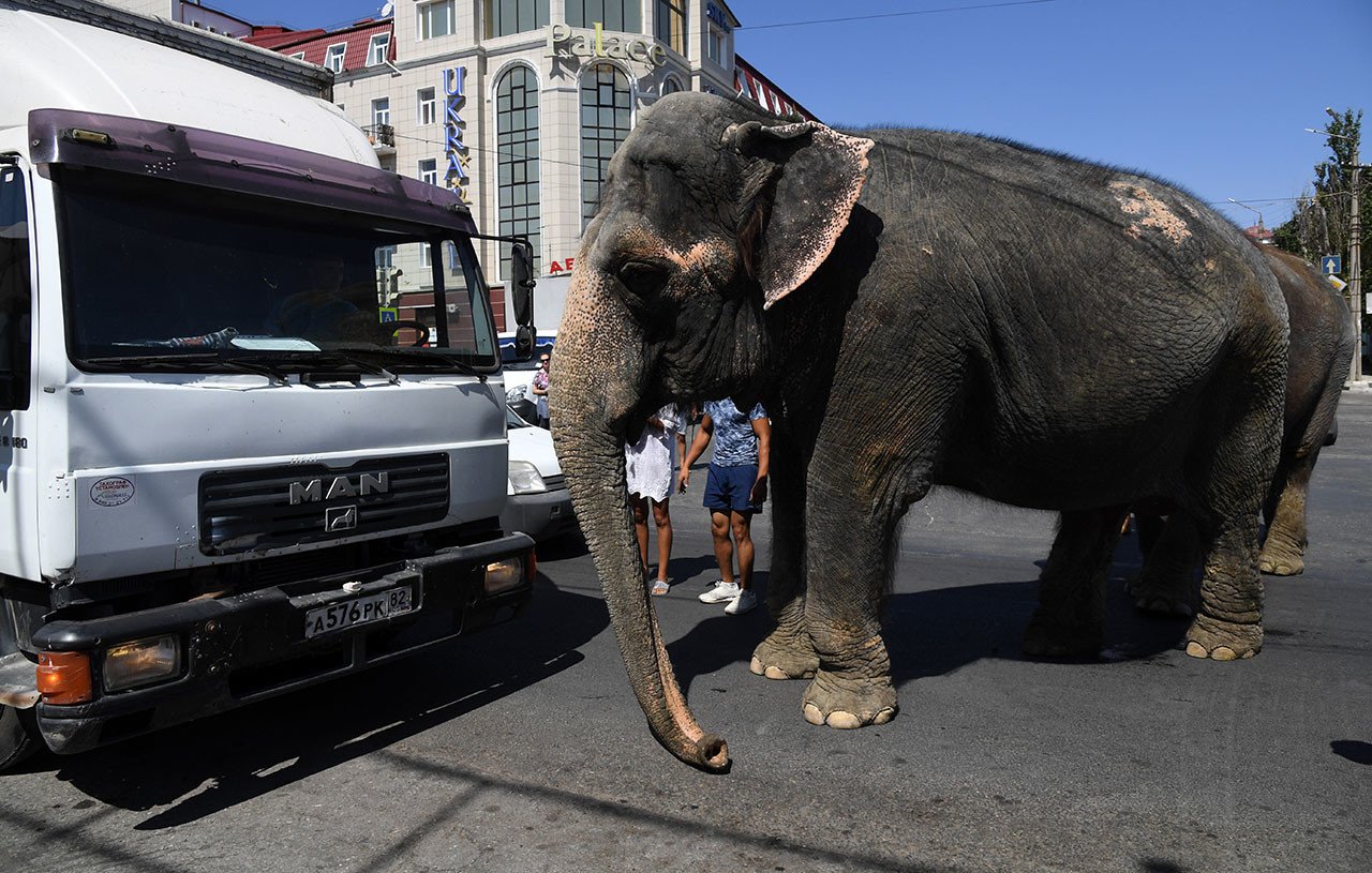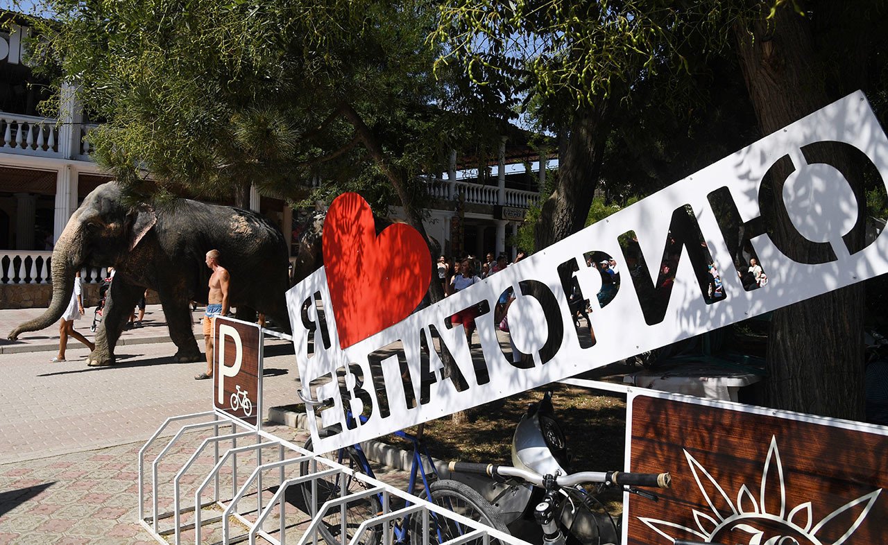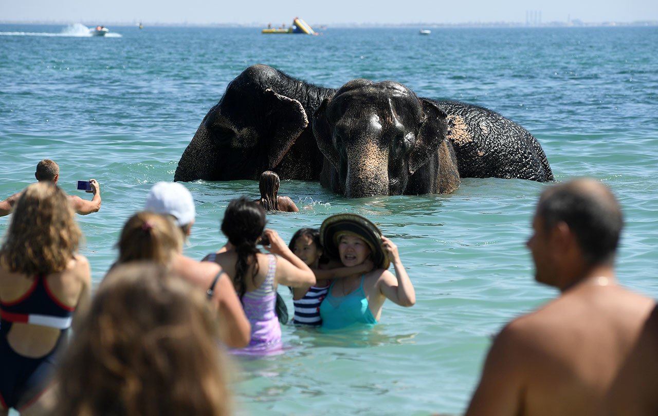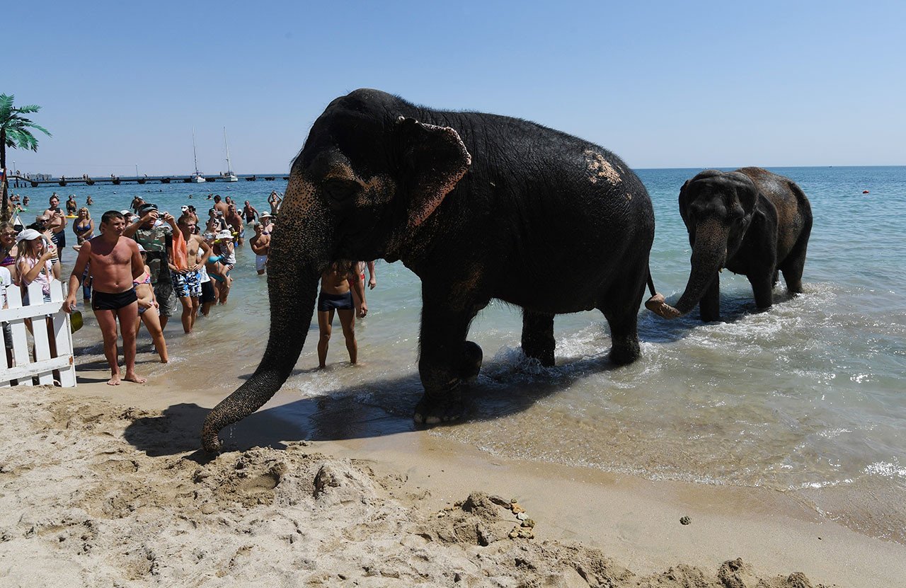 Dos turistas fuera de lo común aparecieron en las playas de la ciudad Eupatoria, en la península de Crimea. Se trata de dos elefantes de circo que visitan regularmente la playa local con su adiestrador, haciendo las delicias de los bañistas, que se hacen fotos en compañía de los paquidermos.