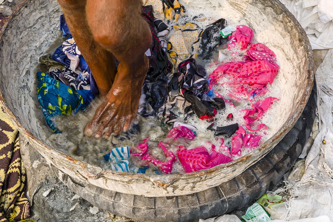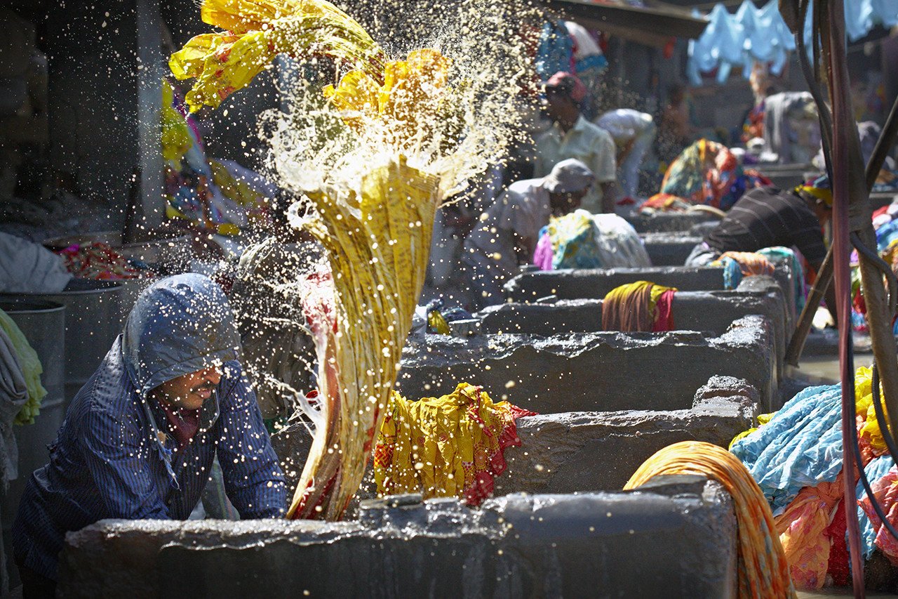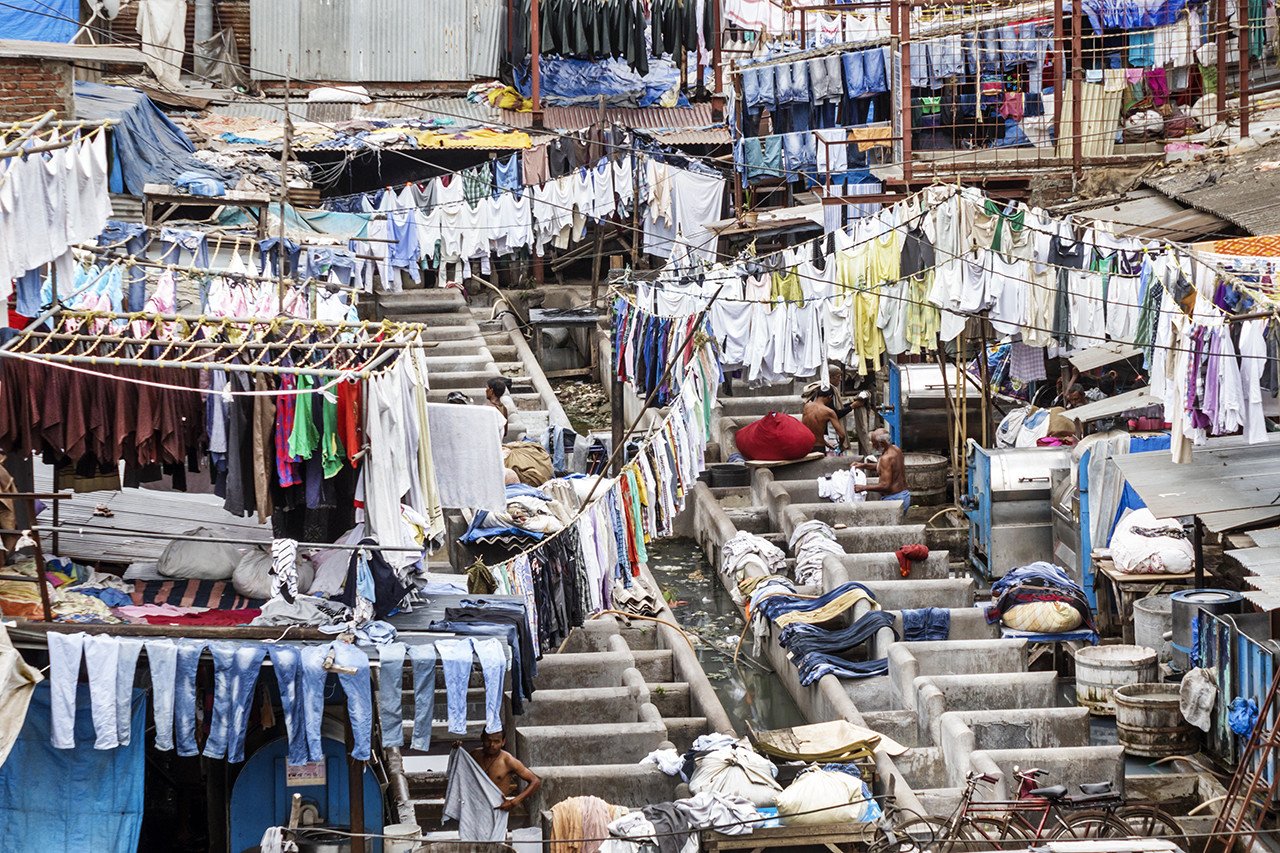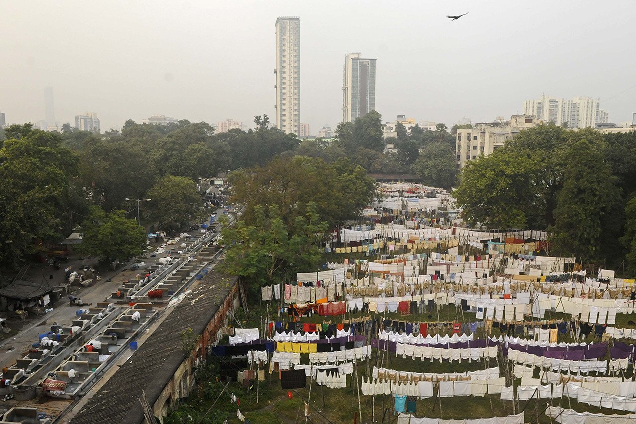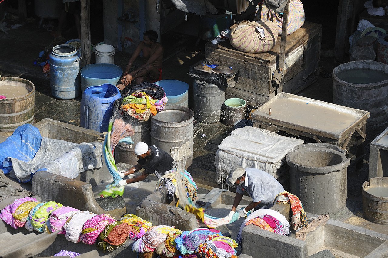 En estos enormes lavaderos cientos de hombres limpian diariamente en Bombay toneladas de ropa a la manera tradicional, es decir, golpeándola contra las piedras. Quienes se dedica a esta tarea pertenecen a la casta de lavanderos de los dhobi, una de las más bajas de la India. Se encargan concretamente de limpiar la ropa de los hoteles y los hospitales de la ciudad. Este masivo centro de lavado y planchado funciona de manera coordinada y las tareas están perfectamente divididas.