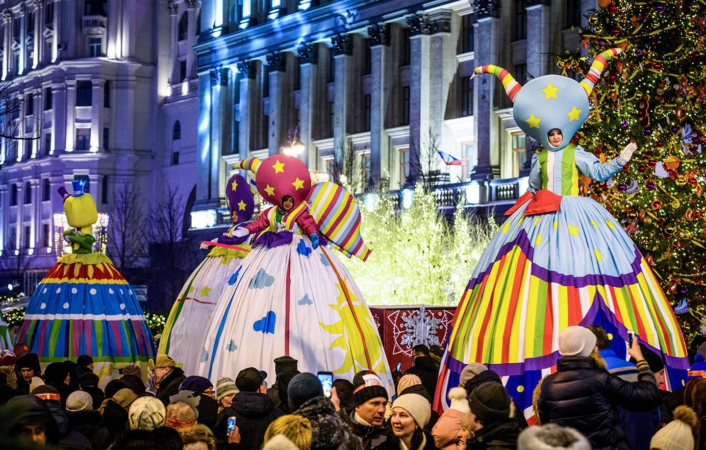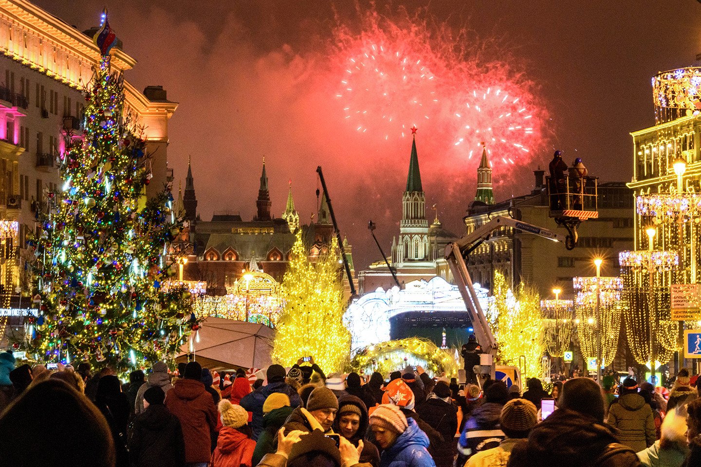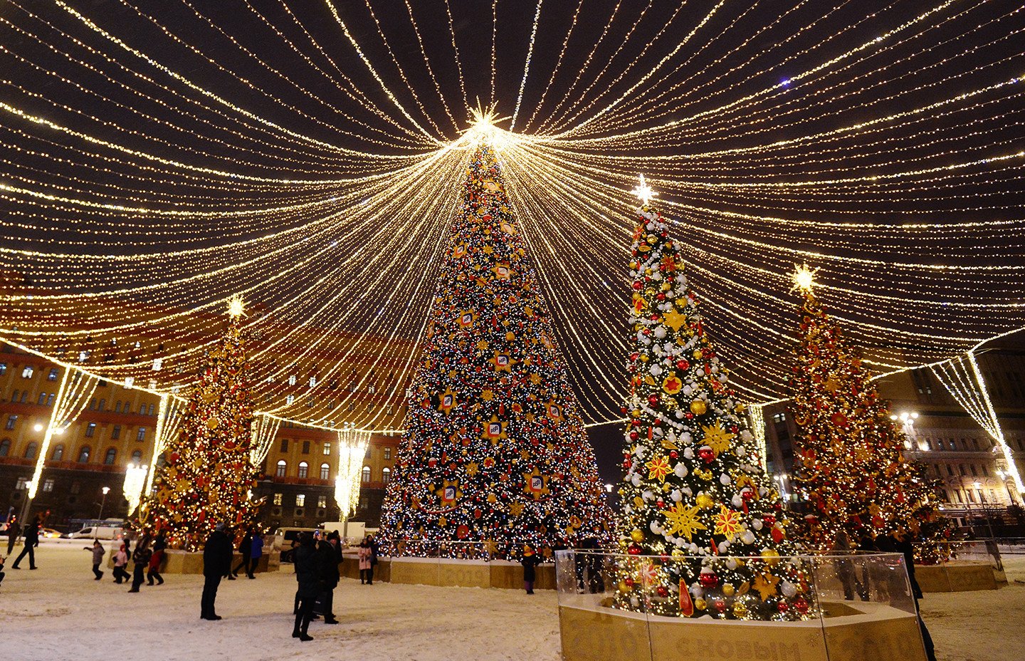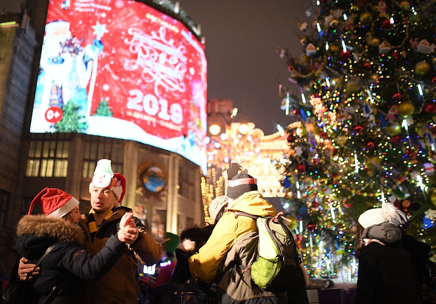 La capital rusa exhibe su cara festiva durante las fiestas navideñas y de Año Nuevo. Las calles de la metrópoli ostentan durante estos días luces de colores, enormes árboles de Navidad adornados con guirlandas (y hasta con libros) y mucha nieve. También se percibe en estas fechas en las coloridas avenidas y plazas moscovitas la atmósfera feriada que se manifiesta vía atavíos insólitos y sonrisas de los habitantes de la urbe y de miles de visitantes.