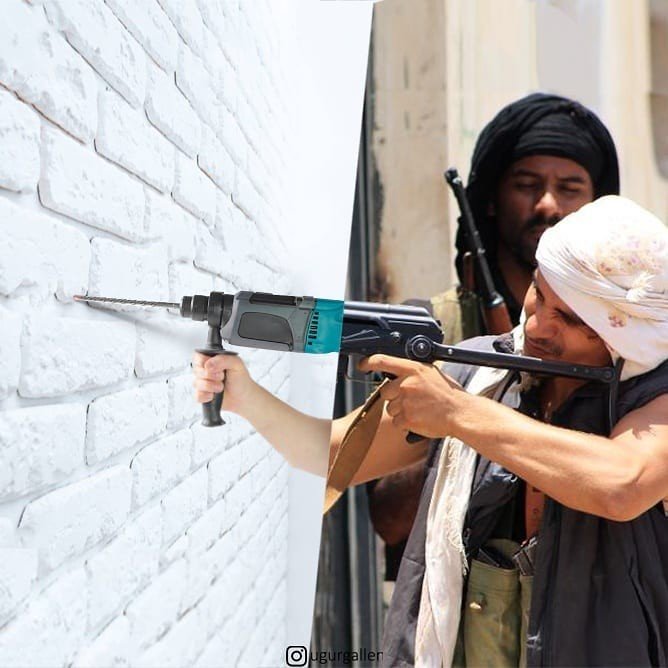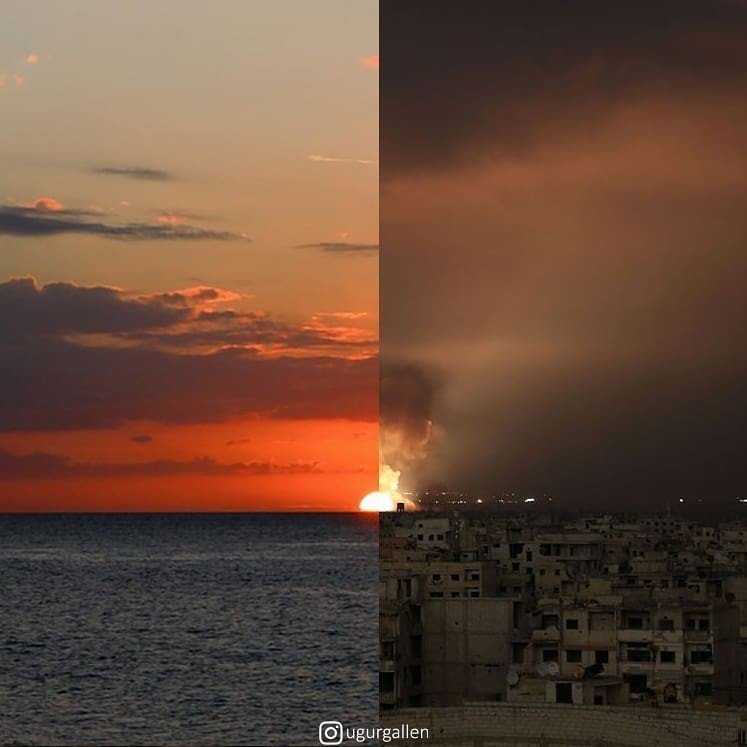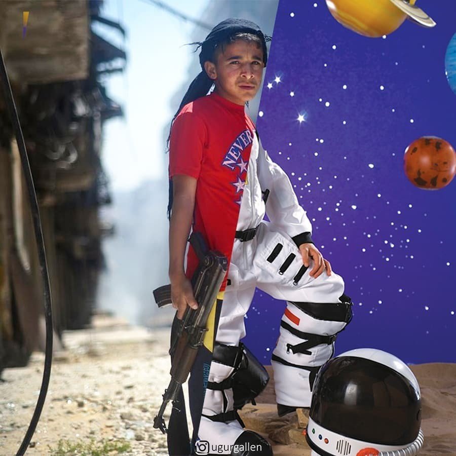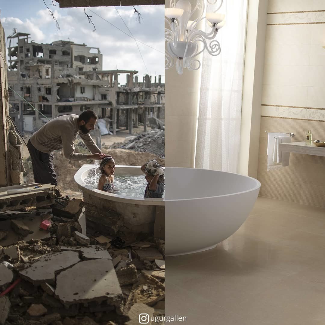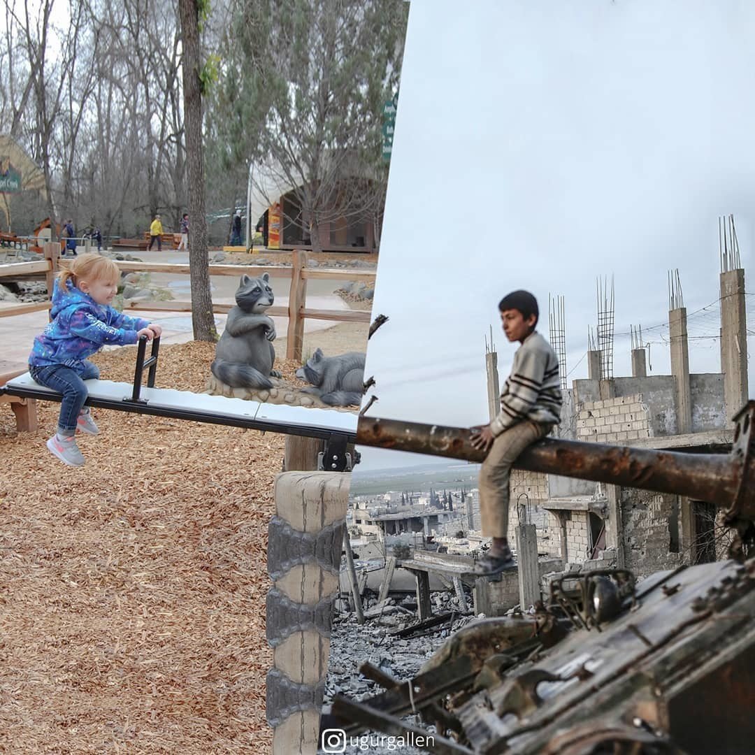 El turco Ugur Gallen publica en su cuenta de Instagram 'collages' que elabora con fotos reales y que reflejan los llamativos contrastes del mundo, sobre todo cuando es la guerra la que establece la línea divisoria. Gallen aboga por un mundo en paz y aborda en sus creaciones temas como la infancia, las armas o el consumismo.