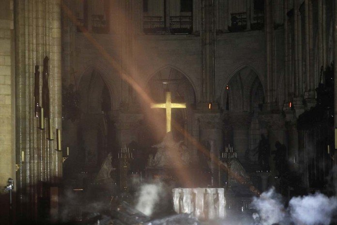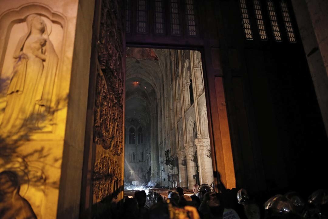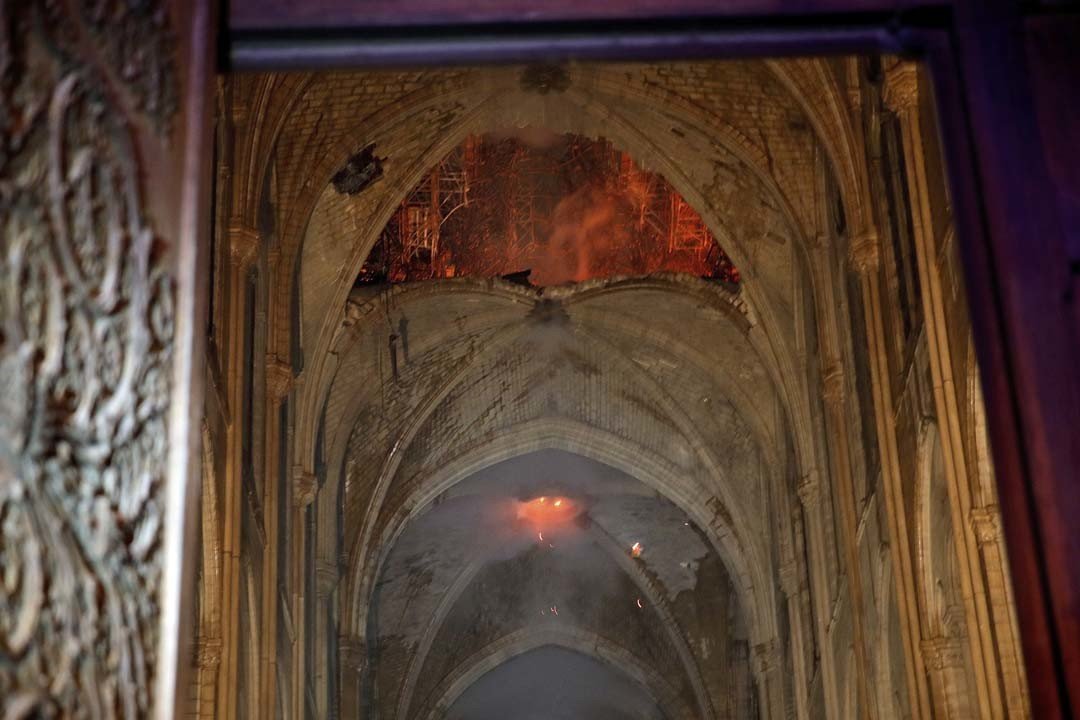 El interior de la catedral de Notre Dame de París tras ser devastada por el incendio
