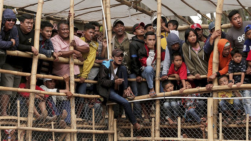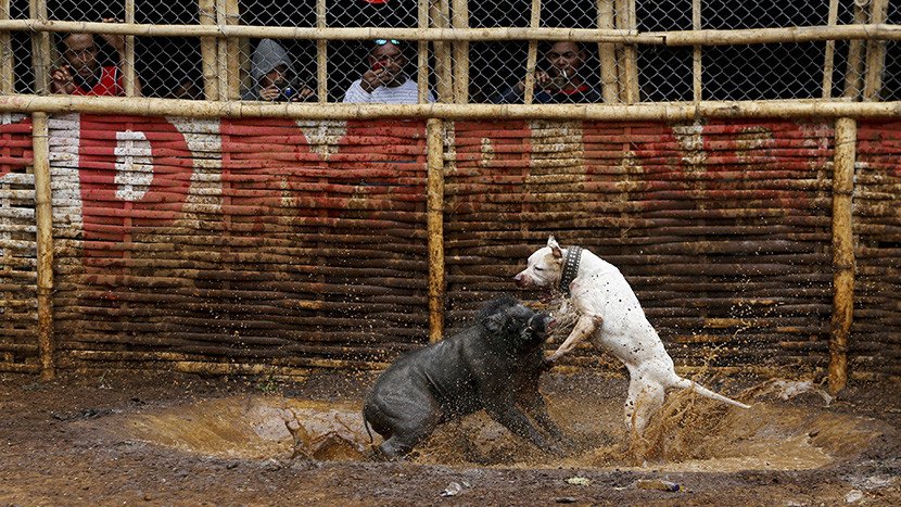 Cientos de aldeanos, que llenan tribunas improvisadas, parecen saborear la lucha entre perros de pelea especialmente criados y jabalíes capturados. Las peleas se conocen localmente como 'adu bagong'.
