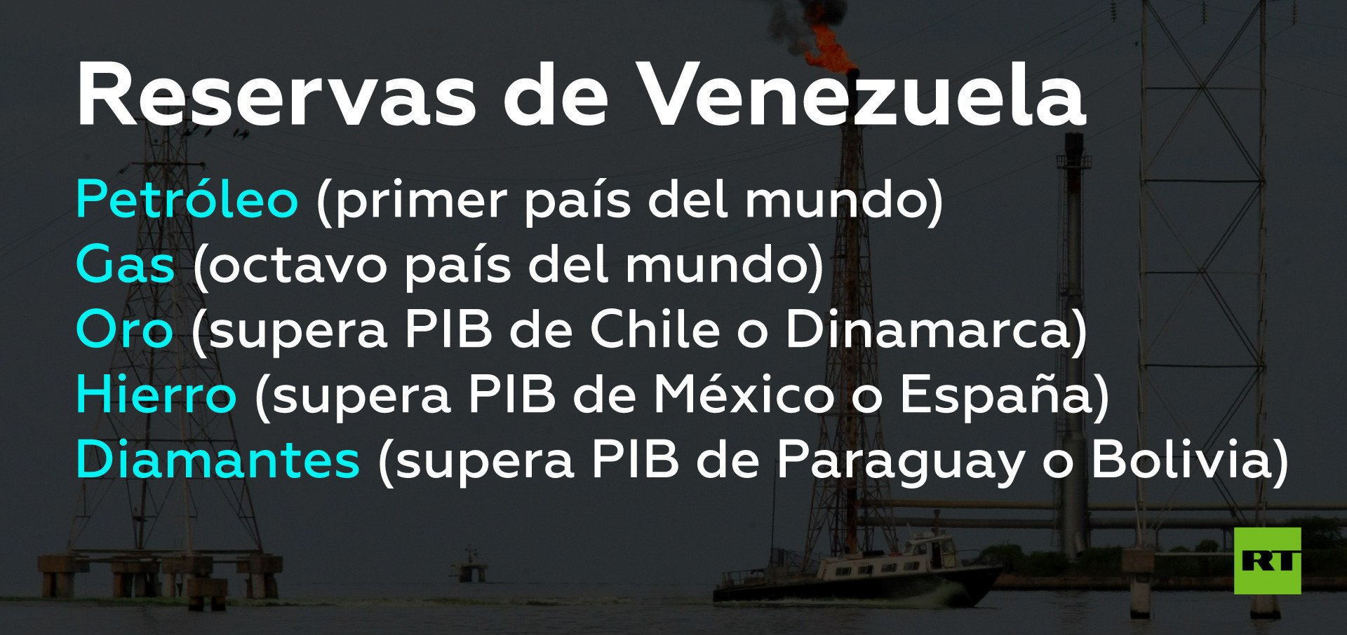 Con reservas probadas, Venezuela es el octavo país del mundo con mayor cantidad de reservas de gas; el primero en petróleo; en oro, el valor de sus reservas supera el PIB de Chile o Dinamarca; en hierro, el valor supera al PIB de México o España; en diamantes, la cifra es mayor al PIB de Paraguay o Bolivia; y para colmo, recientemente se ha demostrado que hay mucho coltán en su territorio.