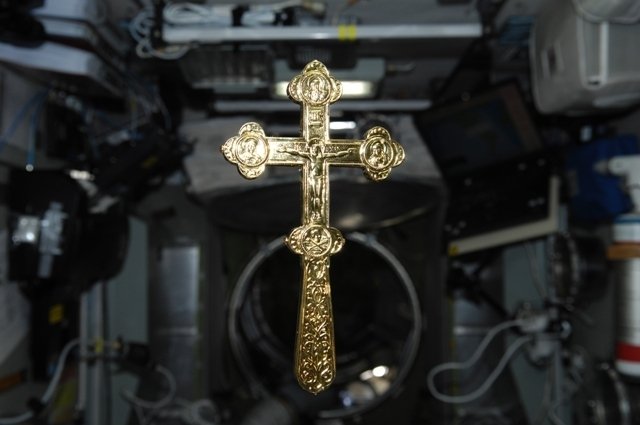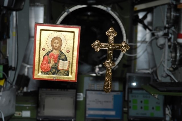 A bordo del segmento ruso tenemos cuatro iconos. Además tenemos un Evangelio y un gran crucifijo. (El crucifijo fue entregado al director de Roscosmos A.N. Perminov por el Patriarca Alexei II. El crucifijo fue llevado a la estación por la tripulación de la Soyuz TMA-8 en 2006, N.de la Red.).