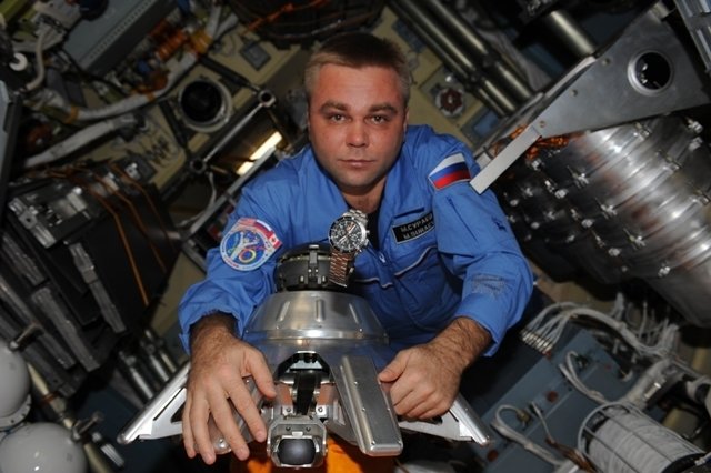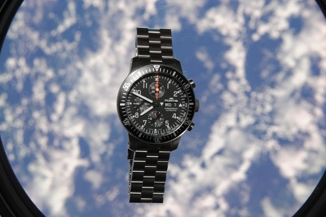 Nuestro reloj espacial de la marca Fortis marca las 12, mientras que en Moscú son las tres de la tarde.