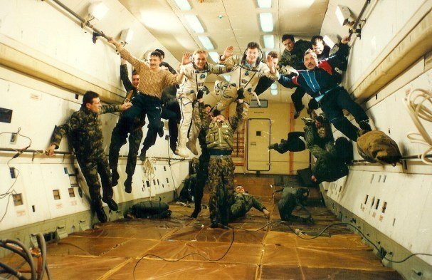 En la foto: entrenamiento en estado de ingravidez (en el centro – la tripulación actual del segmento ruso de la EEI: Maksim Suraev y Román Romanenko). Foto del archivo familiar de los Suraev.