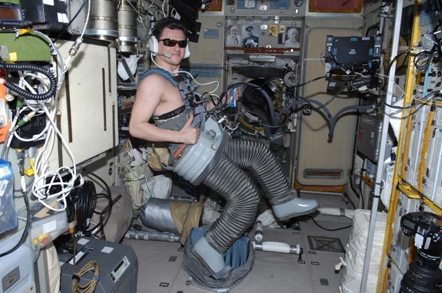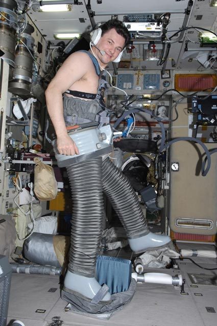 Román se está preparando para el vuelo de regreso a casa. Ya ha comenzado a entrenarse en los"Chibis". Son pantalones especiales, que provocan un flujo de la sangre a la parte inferior del cuerpo. Este proceso se lleva a cabo por una corriente eléctrica. Es para que después en la Tierra el proceso de la rehabilitación sea más rápido. Román se entrenaba en ellos una media hora mientras yo grababa. Al mismo tiempo se registraban los parámetros médicos.