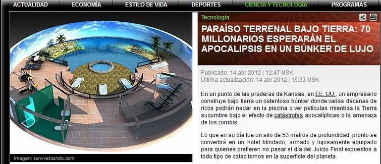 Esta noticia aparecida en el sitio web de RT en español evidencia cómo algunos grupos empresariales privados pueden lucrar de manera efectiva gracias a las teorías que ponen fin a la humanidad para el presente año 2012. No solo en el país norteamericano se aprecia este fenómeno, preparativos, paranoia, como quieras llamarlo. En muchas partes del mundo las personas construyen con sus propios medios materiales y económicos refugios en espera del supuesto cataclismo. Llegó el momento de pensar si tal vez, ¿Nos hace falta esperanza? ¿Creemos todo lo que el gobierno nos dice? ¿Si definitivamente somos débiles y nos dejamos vencer por el miedo y la incertidumbre? O por el contrario, si realmente llegó la hora de poner orden en nuestro sistema de vida. ¿Tú qué opinas? Clic en la imagen para acceder al artículo.