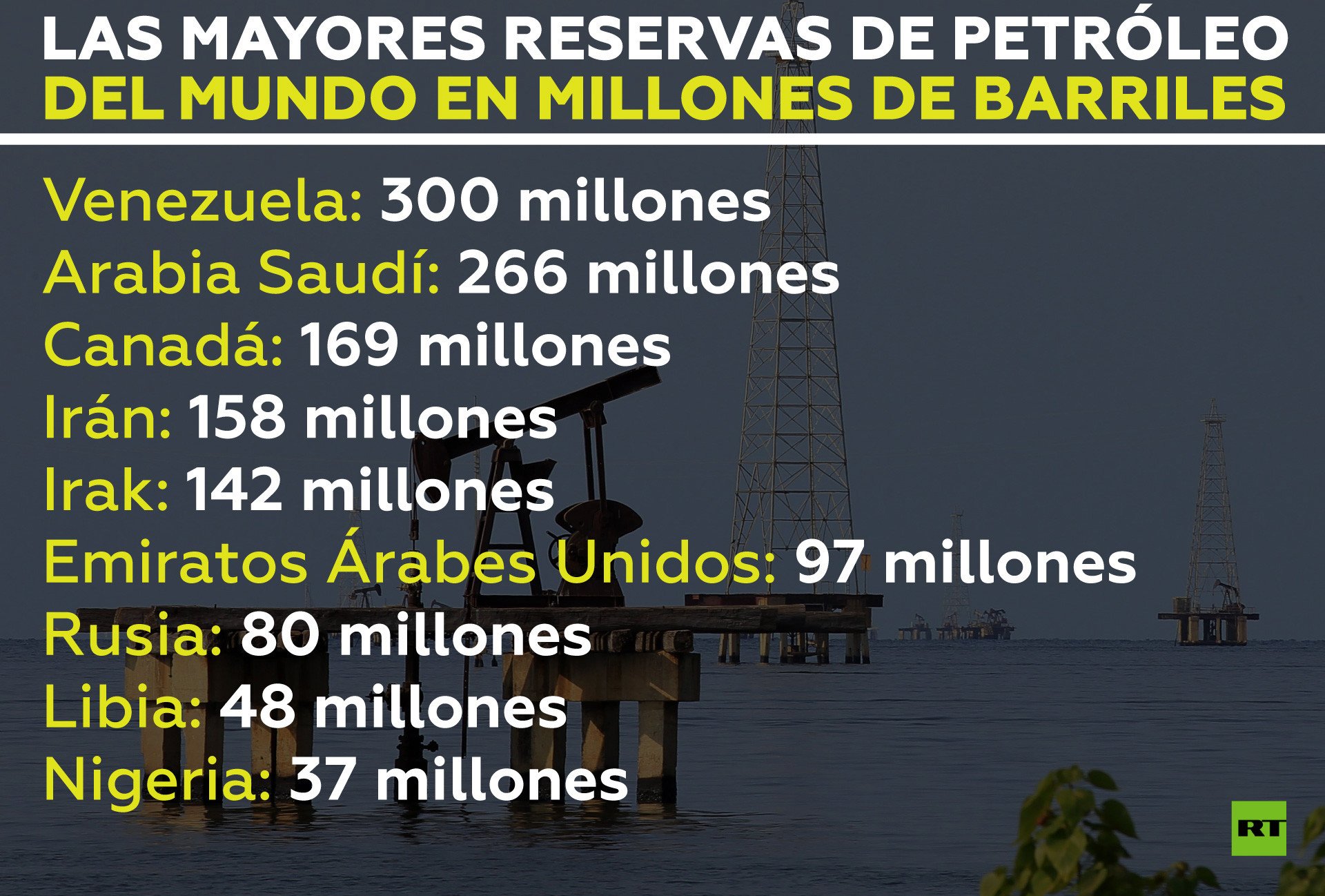 No olvidemos que Venezuela y Arabia Saudí son, por este orden, las mayores reservas petrolíferas del mundo, con 300 millones y 266 millones de barriles. Le siguen Canadá con 169 millones, Irán con 158 millones, Irak con 142 millones, Kuwait con 101 millones, Emiratos Árabes Unidos con 97 millones y Rusia con 80 millones. El resto de los países ni siquiera llega a los 50 millones de barriles de petróleo: Libia tendría 48 millones y Nigería 37 millones de barriles.