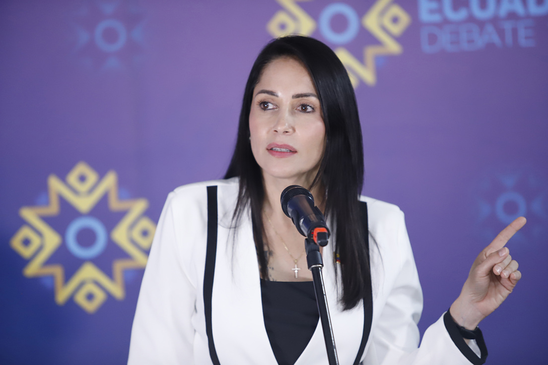 Mostró agresividad en relacionar a Noboa con el narcotráfico y usando una táctica del expresidente Guillermo Lasso, repitió muchas veces un slogan, en el que le tildó de mentiroso: "Noboa, no, no mientas". Su argumentación se basó más en la crítica a la gestión actual que en propuestas propias de gobierno, pero se mostró como una defensora de la institucionalidad, incluida la de las fuerzas armadas y policiales, lo que le puede permitir horadar el centro político que ha venido ganando el anticorreísmo en los anteriores procesos. También le criticó su extracción de clase, al provenir de la familia más rica del país y se mostró como una mujer irredenta que no permite los agravios del joven magnate, sino que más bien "lo pone en su sitio".