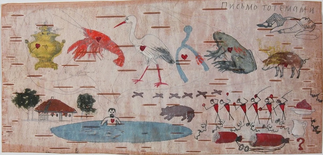 En la carta están dibujados un samovar, un cangrejo de río, una cigüeña, una serpiente, una rana, un cerdo y abajo una imitación de la pintura rupestre, al lado de un paisaje bucólico ruso. En los cuerpos de todos los seres y hasta en el samovar están pintados unos corazones. En vez de papel, el niño usó el material más antiguo de las escrituras rusas: berestá, que es una corteza blanca de abedul. ¿A qué tiempos y desde dónde se dirigiría este mensaje hecho por la mano de quien unas cuatro décadas después cambiaría la historia?
