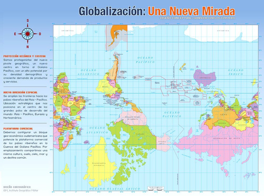 Este mapamundi fue desarrollado por el Instituto Geográfico Militar con miras a incluirlo en los libros escolares. A semejanza del mapa australiano, también está girado, con lo que Chile queda situado en el centro del mismo. El océano Pacífico también ocupa una posición dominante, lo cual está directamente relacionado con la política chilena orientada a convertir al país en un influyente centro de negocios de la región.