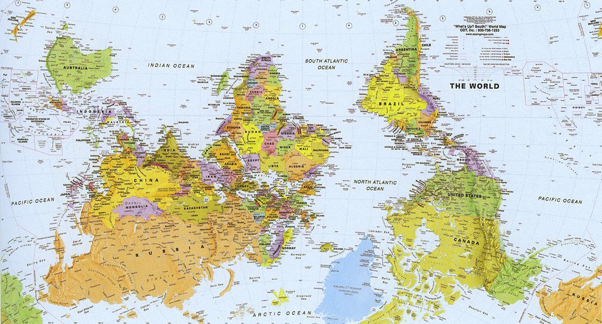 Hay un estereotipo general que determina los países que están 'por encima' y los que están 'por debajo', pero desde el punto de vista astronómico, el Polo Sur bien podría ser el Norte y viceversa. Así, bajo el título 'The world upside down' (el mundo al revés) Australia gira en su mapa el eje vertical 180 grados.