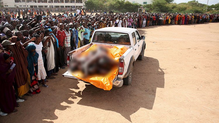 Seguida por los residentes que corrieron al lado del vehículo para ver los cadáveres, la camioneta desfiló con su carga a través de la ciudad hasta que llegó hasta una escuela primaria de Garissa donde estacionó. Las moscas cubrieron las extremidades hinchadas de los terroristas. Cada vez llegaba más gente para ver a los posibles responsables del atentado mortífero de este jueves.