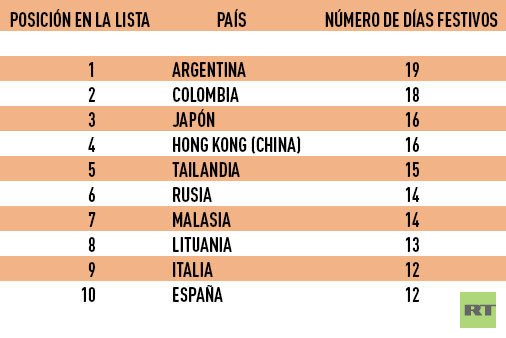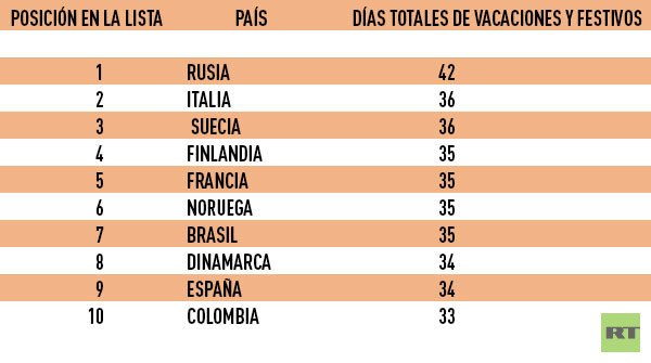 Al sumar los días festivos con las vacaciones pagadas, aparece la lista de los campeones del descanso a nivel mundial. Resulta que en 2015 Rusia está en el primer lugar, con un total de 42 días de descanso. Colombia cierra el 'top' diez con 33 días de vacaciones y festivos para este año.