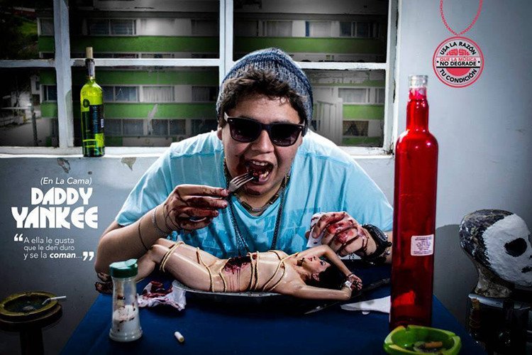 "Usa la razón, que la música no degrade tu condición", es una impactante campaña social colombiana contra el reggaetón, ideada por un grupo de estudiantes y la fotógrafa Lineyl Ibáñez. Las llamativas imágenes invitan a pensar en la literalidad de las letras y el agravio que sufre la mujer en este popular estilo musical.
