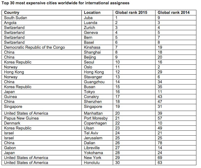 Las ciudades de Suiza, como se podía esperar, figuran en la parte alta de la lista, dado que el tipo de cambio en ese país es muy desfavorable. No obstante, el primer puesto lo ocupa la capital de Sudán del Sur, Yuba, una ciudad infinitamente más pobre, que, por ejemplo, Zúrich. Sin embargo los precios en Yuba son muy altos, ya que Sudán del Sur, el país más nuevo del mundo, se ve obligado a importar casi todos los productos y artículos de uso cotidiano.