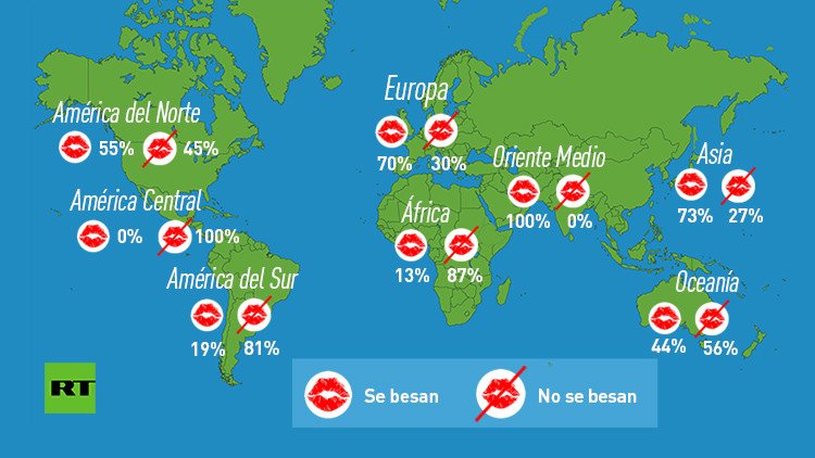 En más de la mitad de las comunidades culturales del mundo el beso no representa una expresión romántica o un deseo sexual y en ocasiones hasta está considerado un acto repulsivo, reza un nuevo estudio de la revista 'American Anthropologist'. La investigación concluyó que el "beso sexual romántico" está presente en tan solo el 46% de las 168 culturas estudiadas.