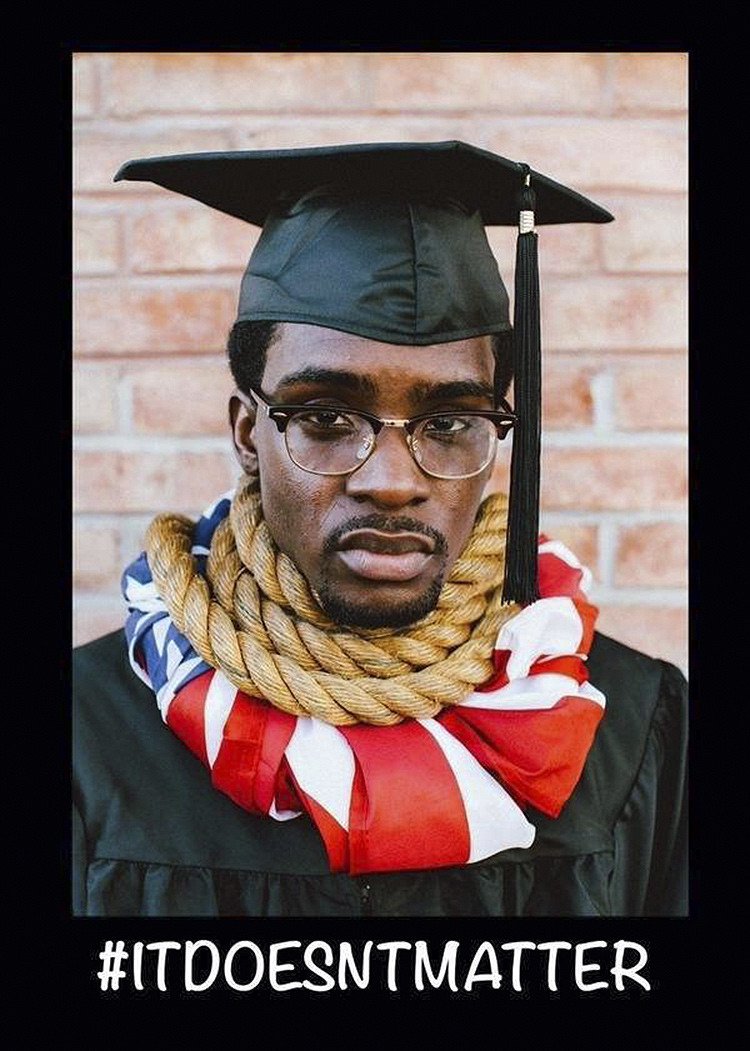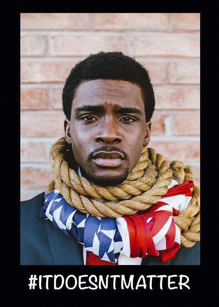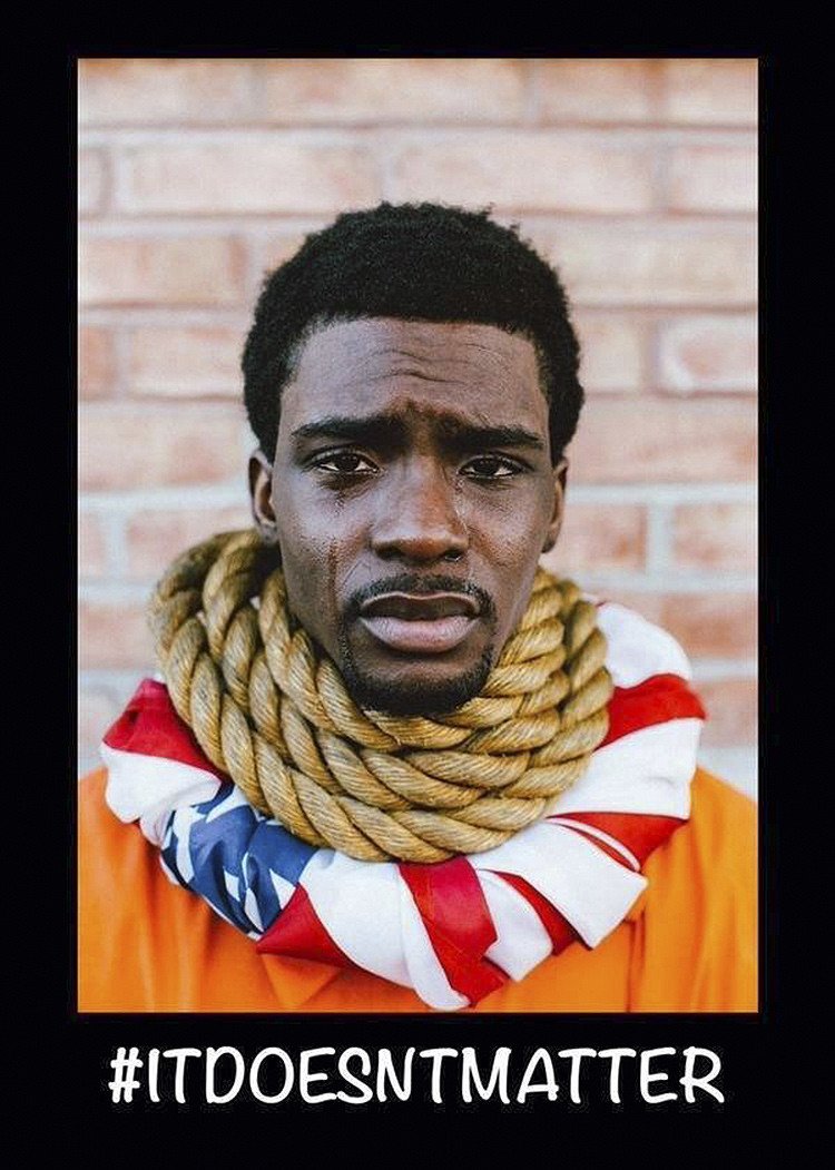 Sin embargo, todas las fotos guardan una similitud: en todas aparece con una soga alrededor del cuello sobre una bandera estadounidense. Morancy además aparecía con lágrimas en los ojos en algunas de las fotos.