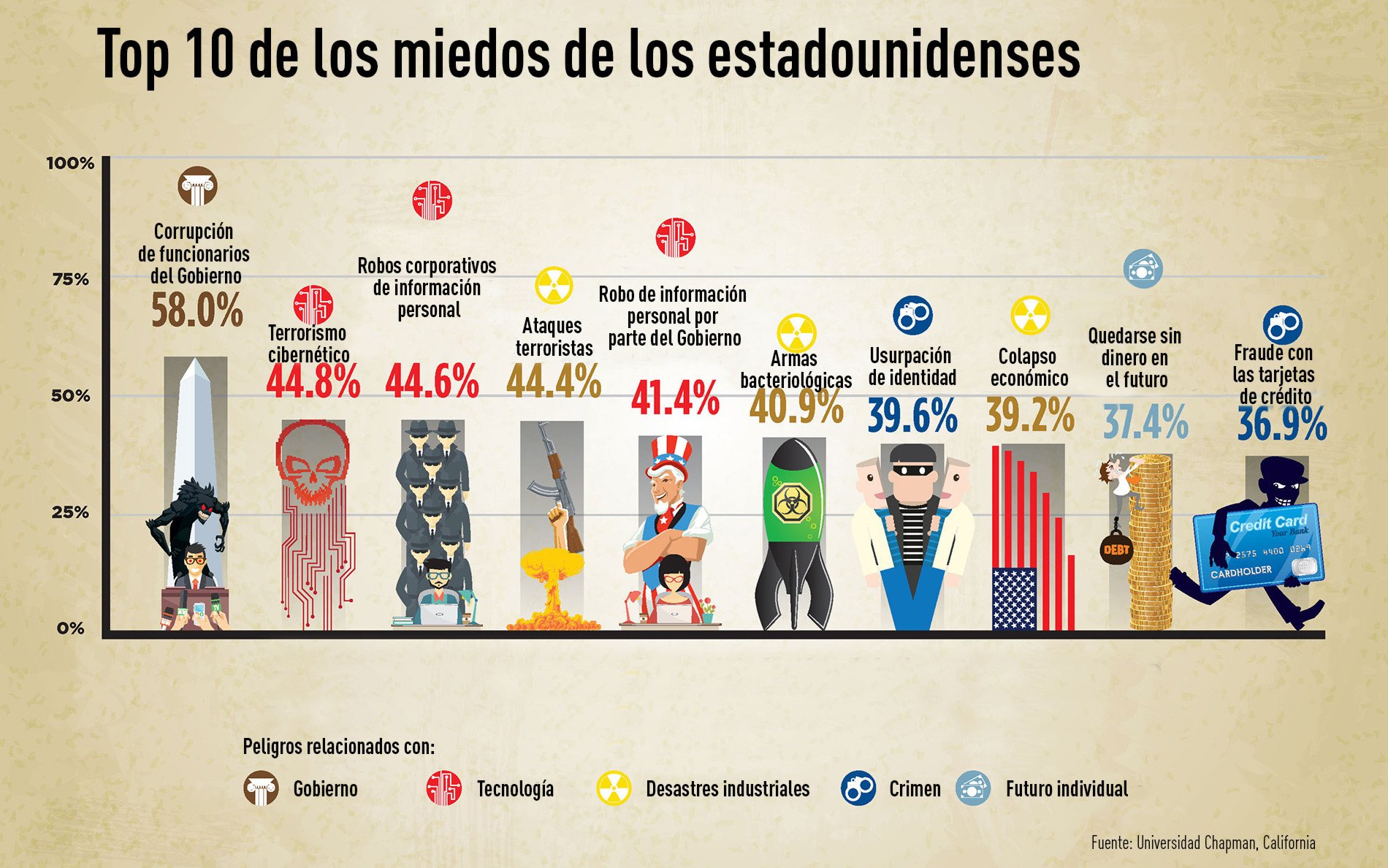 En el sexto lugar según el 'ranking' de miedos de los estadounidenses, publicado en el sitio web EurekAlert!, se situaron las armas bacteriológicas (muy por encima de la bomba atómica). La usurpación de la identidad y un peligro vinculado con ella, el fraude con las tarjetas de crédito, están en el séptimo y el décimo lugar, respectivamente. En EE.UU. la gente tiene también miedo a perder el dinero en el futuro (novena posición), ya sea por motivos macroeconómicos o personales, aunque esto les preocupa un poco menos que la posibilidad de que se produzca un colapso económico (octava posición), independientemente de si es a escala nacional o mundial.