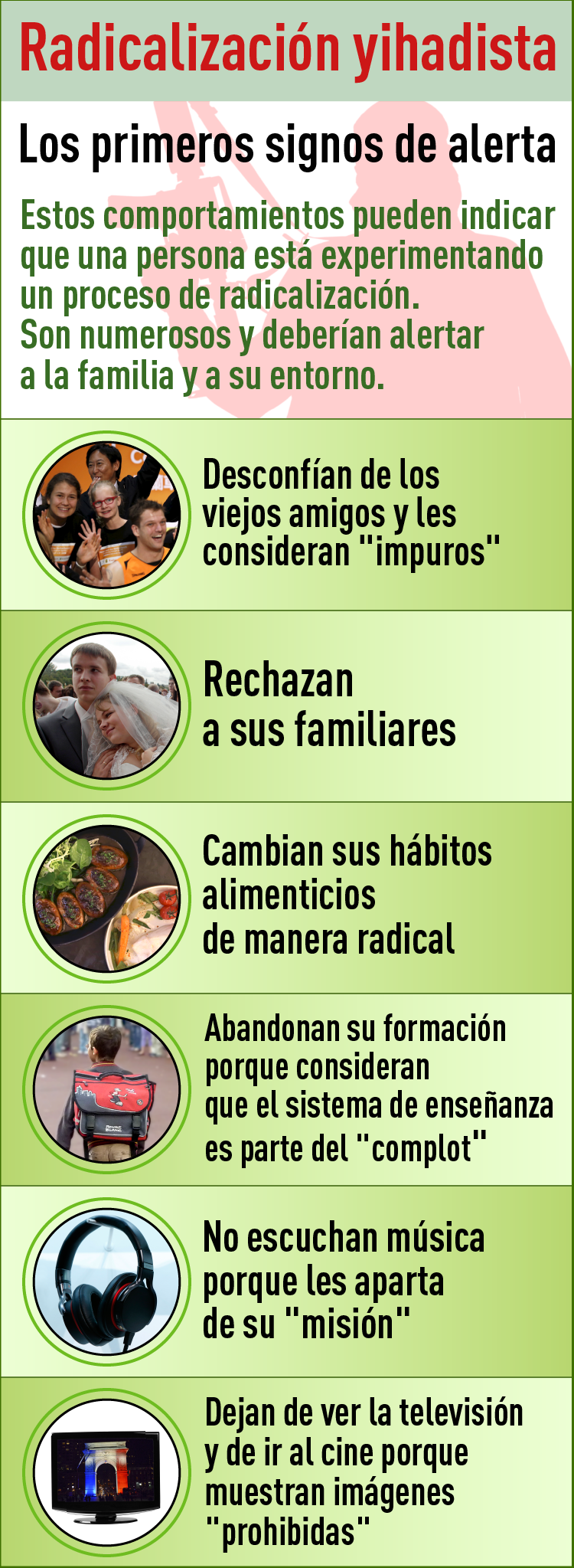 En el momento de optar por el modo de vida yihadista, los terroristas cortan todo contacto con sus viejos amigos, rechazan a la familia, no ven la televisión, no van al cine, no escuchan música ni practican deporte, ya que todo ello representa una influencia negativa que los aparta del camino extremista. Estos y otros signos deben alertar a la familia y a su entorno.