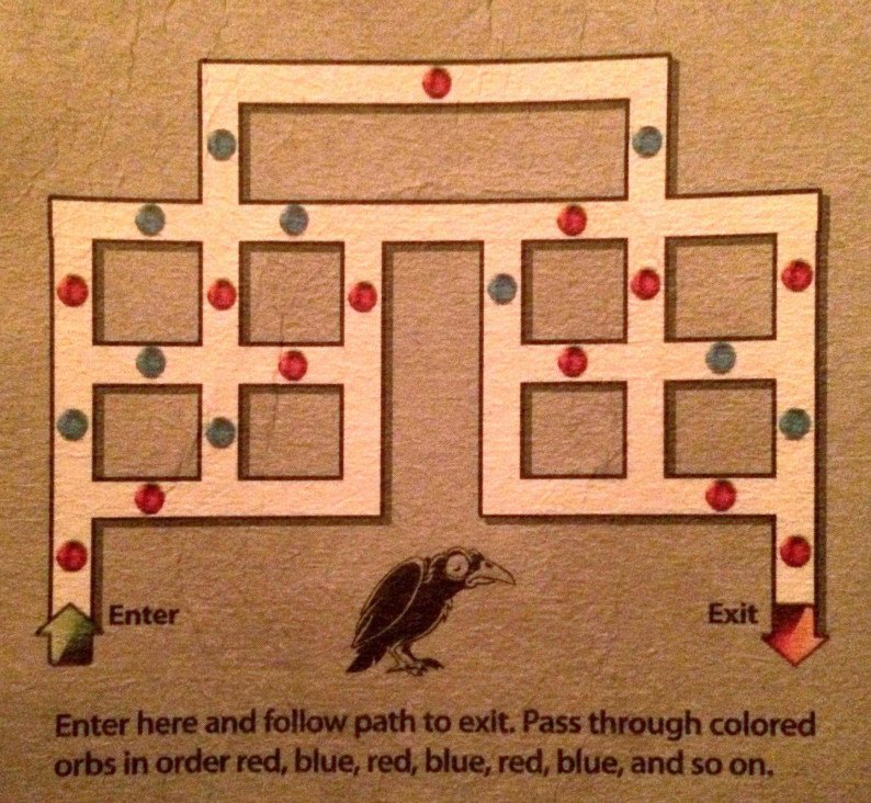 El rompecabezas, impreso en un posavasos de bar, representa un laberinto con círculos rojos y azules repartidos en su interior. A la izquierda se sitúa la entrada al laberinto y a la derecha, su salida. Las instrucciones que dicta el acertijo establecen que "hay que encontrar un camino hasta la salida pasando a través de los orbes en orden rojo, azul, rojo, azul, rojo, azul y así consecutivamente".