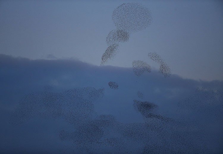 Al atardecer, cuando el cielo se vuelve poco a poco rojo, miles de estorninos surcan el aire y se ponen 'a bailar' sobre Roma, creando fascinantes formas geométricas, mezclándose con las nubes.
