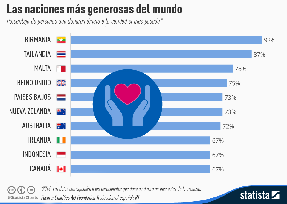 En lo que respecta al porcentaje de la población que más donaciones realiza a la caridad, Birmania ocupa el primer lugar donde el 92% de sus habitantes ha contribuido con dinero en causas solidarias al menos una vez. A continuación se encuentra Tailandia con el 87%, cifra que es respaldada al parecer por una práctica budista muy común entre la gran mayoría de sus ciudadanos conocida como 'Dana', que invita a cultivar la generosidad incondicional sin ningún sentimiento de apego material.