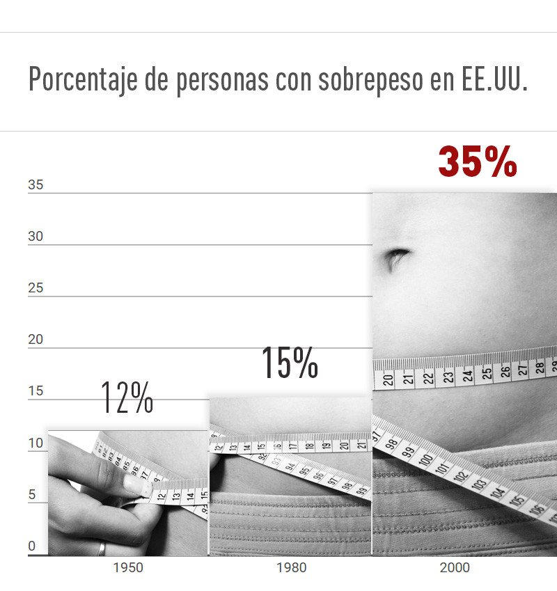 Las cifras hablan por sí solas. Si en los años 50 el 12 % de los estadounidenses sufría obesidad, en la década de los 80 ese porcentaje aumentó hasta el 15 %, mientras que en torno al año 2000 uno de cada tres estadounidenses era obeso y aumentaron los índices de diabetes tipo 2, vinculada con este problema.