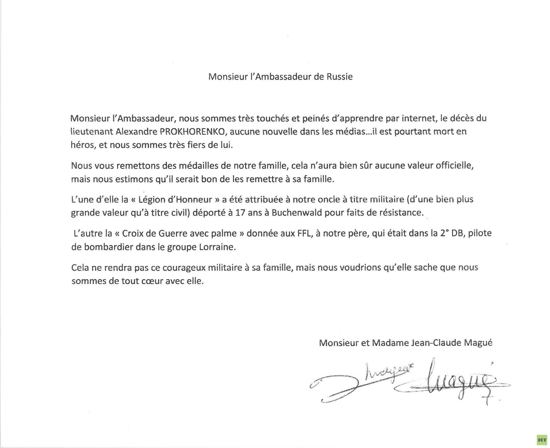 "A principios de abril llegó a la Embajada un certificado en el que había dos cajas de cuero viejo y una carta de la familia francesa Magues. Estaban sorprendidos con que la prensa francesa no dijera nada sobre la muerte heroica de Alexánder Projorenko, por lo que pedían transferir a su familia las condecoraciones militares familiares que tenían guardadas", ha declarado a RIA Novosti un representante de la Embajada rusa en París, añadiendo que no se trata de la única carta de homenaje recibida. El oficial ruso Alexánder Projorenko ha sido condecorarado de forma póstuma con la Orden de Héroe de Rusia.