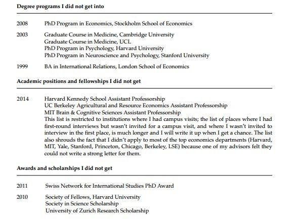 El profesor organizó el CV en distintas categorías. Algunas de ellas muestran los programas de estudio en los que no consiguió la nota que necesitaba. Asimismo, figuran cargos académicos que no obtuvo y becas que le rechazaron. También aparece la financiación para una investigación que no logró conseguir.