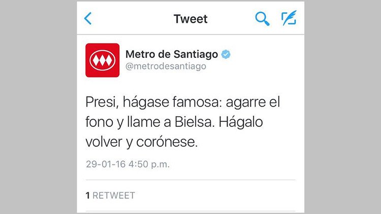 El Metro de Santiago ha publicado este viernes un particular mensaje en su cuenta de Twitter, en el que aconsejaba a la presidenta de Chile, Michelle Bachelet, que pusiera a Marcelo Bielsa al frente de la selección de Chile.