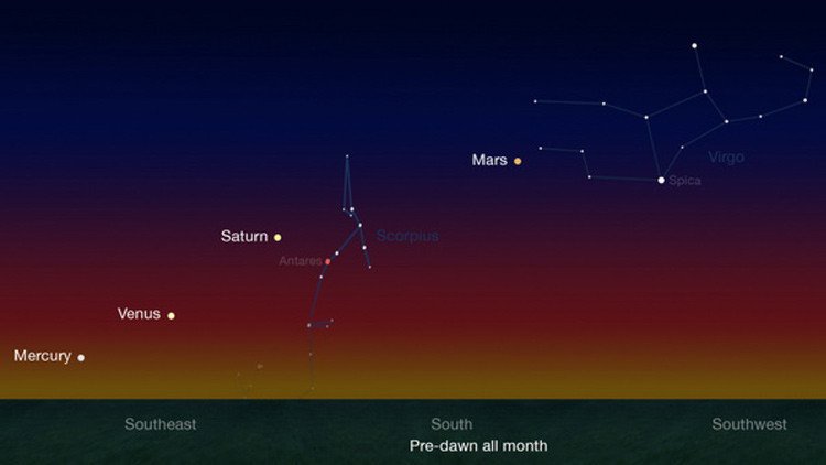 El recientemente iniciado fenómeno espacial se podrá observar en los próximos días. De este modo, Saturno, Mercurio, Venus, Marte, Júpiter y la Luna se alinearán para formar un 'desfile de planetas brillantes', informa el planetario de Moscú, citado por TASS. El fenómeno consiste en que una serie de planetas del sistema solar se aproxima hacia un lado del sol dentro de un sector relativamente pequeño.