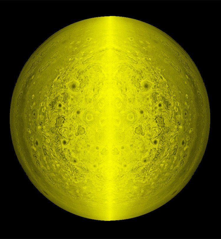 En la instantánea obtenida por Juno solo queda iluminada mitad del lejano planeta, por lo cual que Ahn recurrió a técnicas de montaje: copió y volcó en el otro lado la media sonrisa para lograr una sonrisa completa. Luego procesó la foto para darle un tono amarillo.