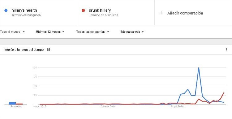 Aunque la tendencia 'drunk Hillary' (Hillary ebria) no tiene artículos fiables que confirmen el estado ebrio de la política, la hipótesis comenzó este otoño a atraer el interés de usuarios en motores de búsqueda. No en vano, 'Drunk Hillary' superó la tendencia 'Hillary’s health' (salud de Clintin) a finales del pasado mes de octubre.