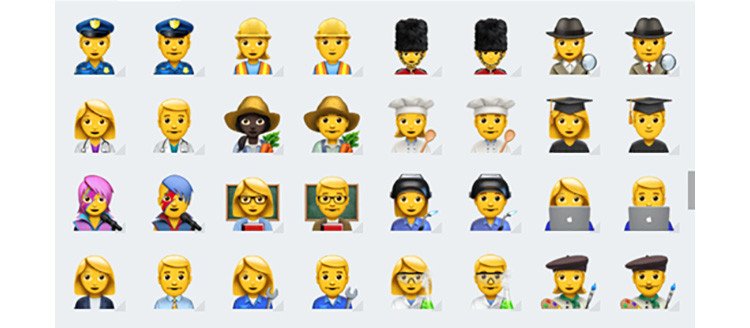 Entre los nuevos iconos figura un 'facepalm', un 'selfie', una mujer embarazada, una madre y un hijo o un padre con dos hijos. Además, la actualización cuenta con una serie de versiones femeninas de muchos trabajos, deportes y actividades que antes solo estaban presentes en su versión masculina. Asimismo, como en otros 'emojis' anteriores, existe la posibilidad de elegir el color de piel.