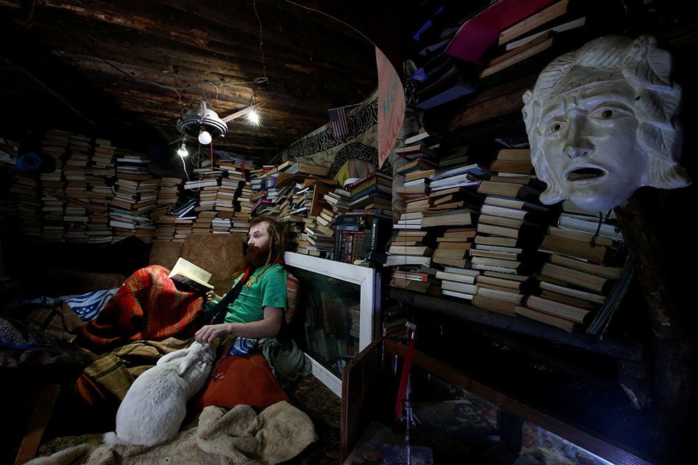 Hace tres años y medio Yuri dejó el departamento que alquilaba en Moscú y encontró en los alrededores de la capital rusa un pedazo de tierra donde instalarse. Primero tenía una carpa, pero luego construyó una caverna bajo tierra. Ahora tiene en su morada cientos de libros, un hacha, un conejo, una estufa a leña, una tablet, especias para cocinar sopas, una ducha y hasta un sauna de barro.