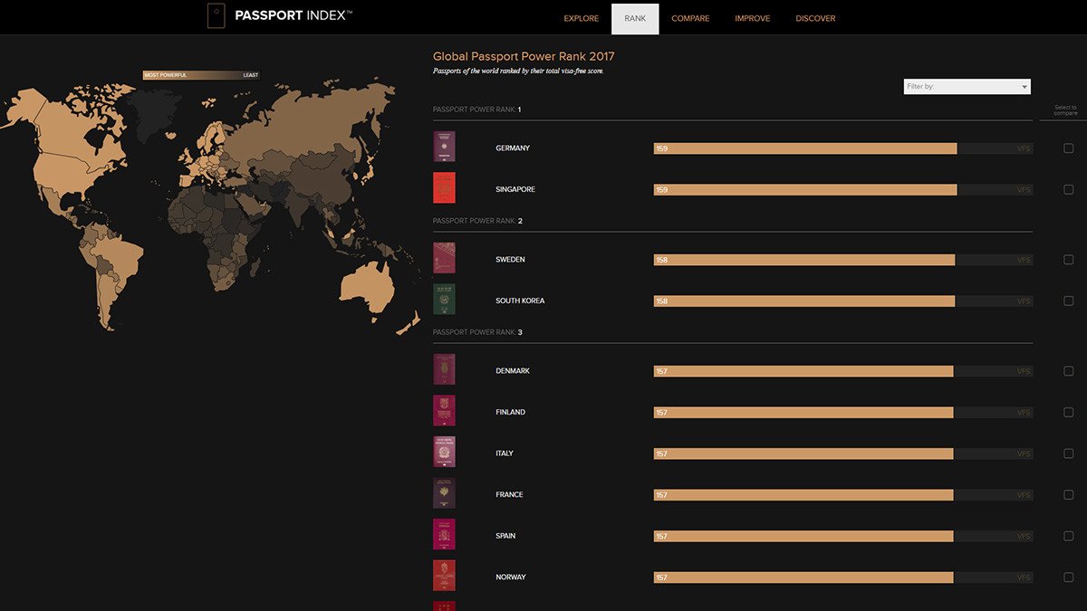 Según esta clasificación titulada 'El 'ranking' global del poder del pasaporte 2017' (Global Passport Power Rank 2017), este año los documentos más 'poderosos' son los de Alemania y Singapur, que abren las puertas a 159 países. Les siguen Suecia y Corea del Sur, con 158 países.