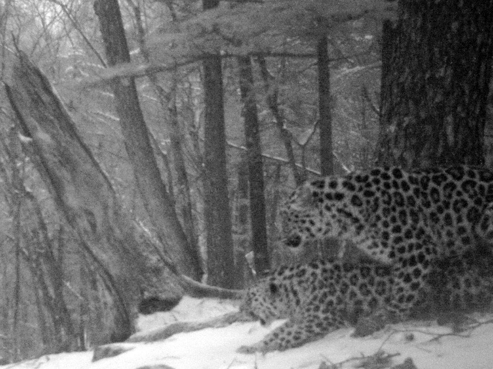 Una cámara del parque nacional Tierra del Leopardo activada por control remoto ha registrado por primera vez en la historia cómo 'retozaba' una pareja de leopardos salvajes del Lejano Oriente de Rusia.
