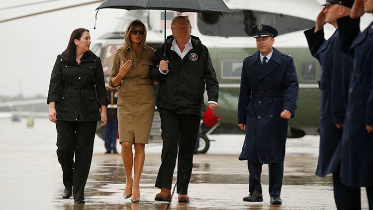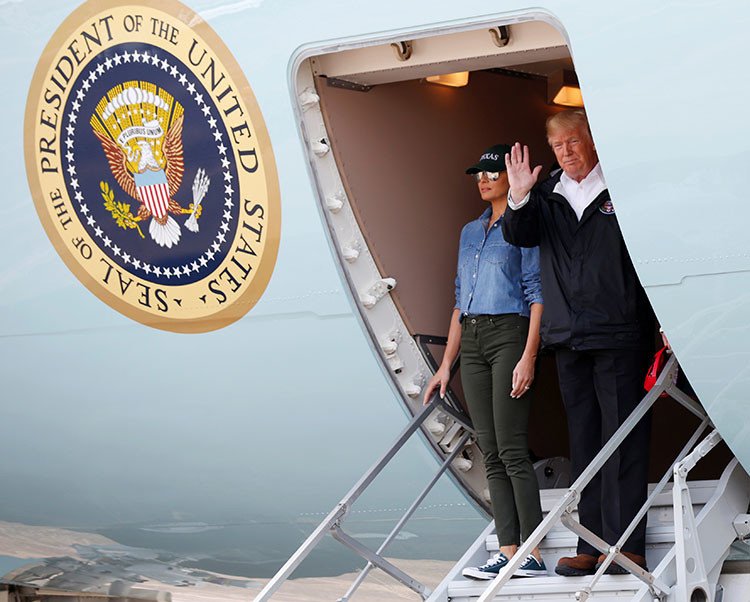 Durante el vuelo se cambió de calzado y de vestido, y al llegar a Houston salió del avión en una camisa de mezclilla, pantalones vaqueros y zapatillas deportivas. Es el segundo viaje de la pareja presidencial a la zona del desastre, durante el cual tienen previsto visitar a miles de refugiados afectados por el desastre natural.